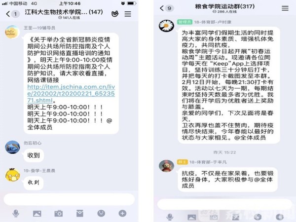 各學院輔導員通過家長QQ群、給家長一封信等方式,及時發布上級部門精神、學校公告、權威疫情防控指南等;點對點了解重點疫區學子及其家庭成員的身體狀況、居家隔離狀況,將學校的關心和牽掛及時傳遞給他們,并給他們郵寄防疫物資。同時,積極發動家長力量,提升疫情期間學生管理工作監督力,與家長共同加強學生的自我防護、學業規劃、身體健康等方面的關心,通過家校聯合,讓學生真正做到停課不停學、提優補差。糧食學院輔導員建立學院運動群,開展“初春運動周”主題活動,號召廣大同學加強居家鍛煉,每天堅持訓練三十分鐘,并進行打卡分享。