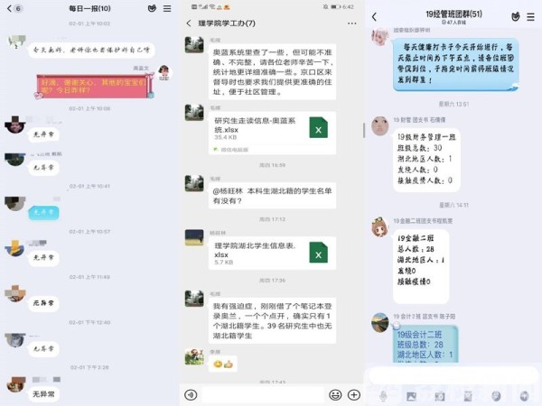 對2萬余名學生的叮囑、對重點疫區學子的關注,成為近期廣大輔導員的工作日常。為準確掌握學生的健康狀況,做到情況明、數據準,廣大輔導員充分發揮組織優勢,利用各類網絡平臺,分類管理、全面摸排,充分發揮寢室長、班長、學生黨員等學生骨干和團學組織作用,建立宿舍、班級、專業、年級等多級網格化統計匯報制度,建好湖北籍學子、走讀學子、延長學制學子等疫情防控重點學生檔案,每天細心做好每一位學生防控信息排查、統計和上報工作,督促廣大學生完成日常健康打卡,嚴格落實“日報告”和“零報告”,跟蹤每一位學生健康狀況。