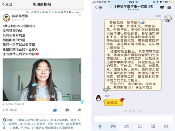 廣大輔導員充分利用學習強國、微信視頻、釘釘等網絡平臺定期組織召開網絡視頻主題班會。網絡視頻主題班會不僅傳達上級部門和學校關于疫情防控的部署、居家隔離注意事項等,更細致地看到每位同學居家隔離和心理狀況。各位老師充分發揮班級、團支部、黨支部、義工站等學生組織的作用,組織各種“我向母校報平安”、“武漢加油!”等主題活動,進一步提升班級同學共同抗疫的信心,并動員廣大學生在保護好自己的基礎上,積極參與所在社區或村鎮的各類防疫志愿服務活動。