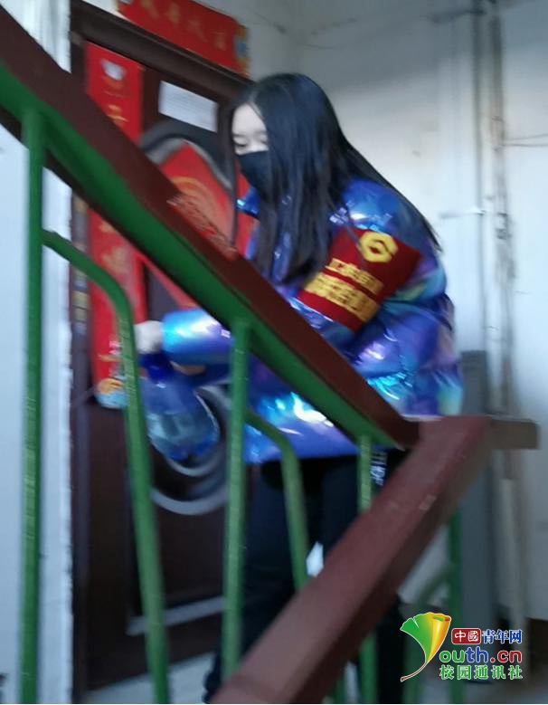 19級港口航道與海岸工程專業學生田詩熠在樓道噴灑消毒液,不放過任何一個死角。每代人有每代人的青春,每代人有每代人的征程,在不經意之間,這些逆流而上的科大船海青年志愿者們,拉起風帆,奔向了自己的征程,不論風霜雨雪,心之所向,路之所往,他們年輕的身影,是當代中國青年的使命與擔當;他們年輕的臂膀,是中國精神和中國力量的生命力所在。