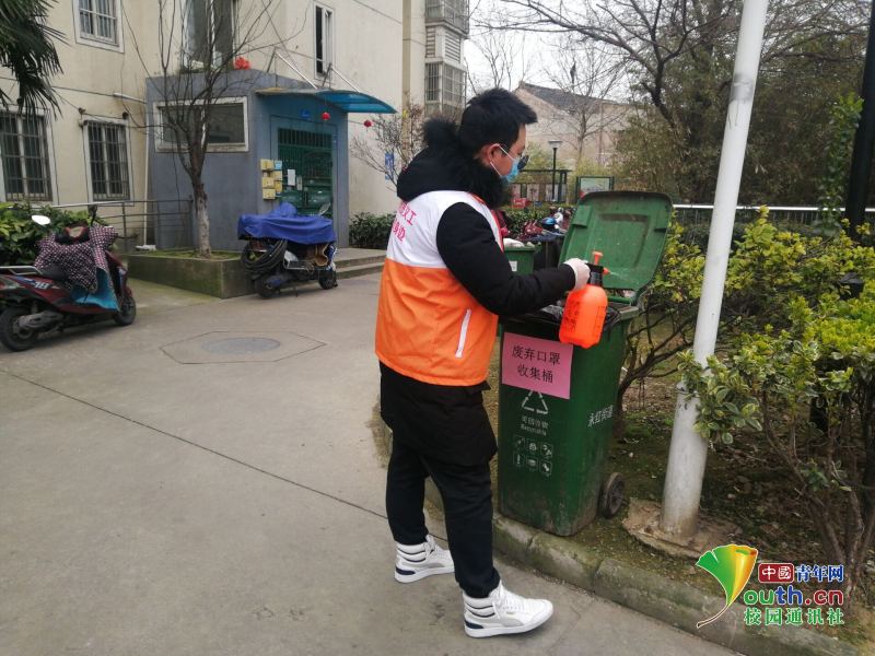17級海洋工程與技術專業的學生沈奕對小區垃圾桶進行消毒,為社區的居民的健康安全多增添一份保障。