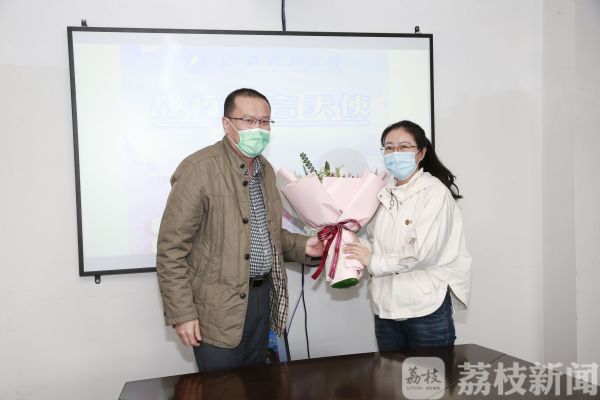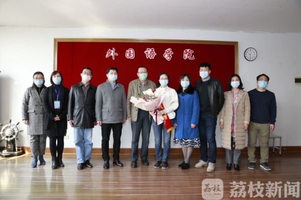 江蘇科技大學黨委常委、副校長湯建為高秀老師獻上了象征美好祝愿的鮮花,代表學校送上感謝,他表示,外國語學院的“家文化”深入人心,高秀老師“舍小家,為大家”展現了大愛,她的“逆行”讓人由衷贊賞,希望務必做好防護,平安去、平安回,期待凱旋歸來。
