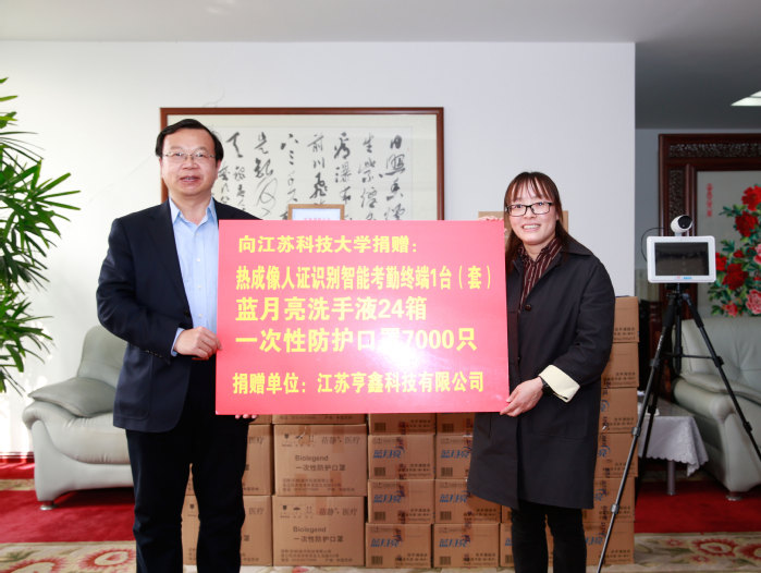 4月17日下午,江蘇亨鑫科技有限公司向學校捐贈一批疫情防控物資助力開學,這批捐贈物資包含熱成像人證識別智能考勤終端1臺、藍月亮洗手液24箱、一次性防護口罩7000只。宜興市人社局市場辦處長陳霽,江蘇亨鑫科技有限公司人力資源部長溫慧敏等一行三人專程來校捐贈疫情防控物資。校長周南平、副校長湯建出席捐贈儀式,學生處、團委、繼續教育學院、教育發展基金會等相關職能部門負責人參加捐贈儀式。儀式由對外合作處處長佘建國主持。