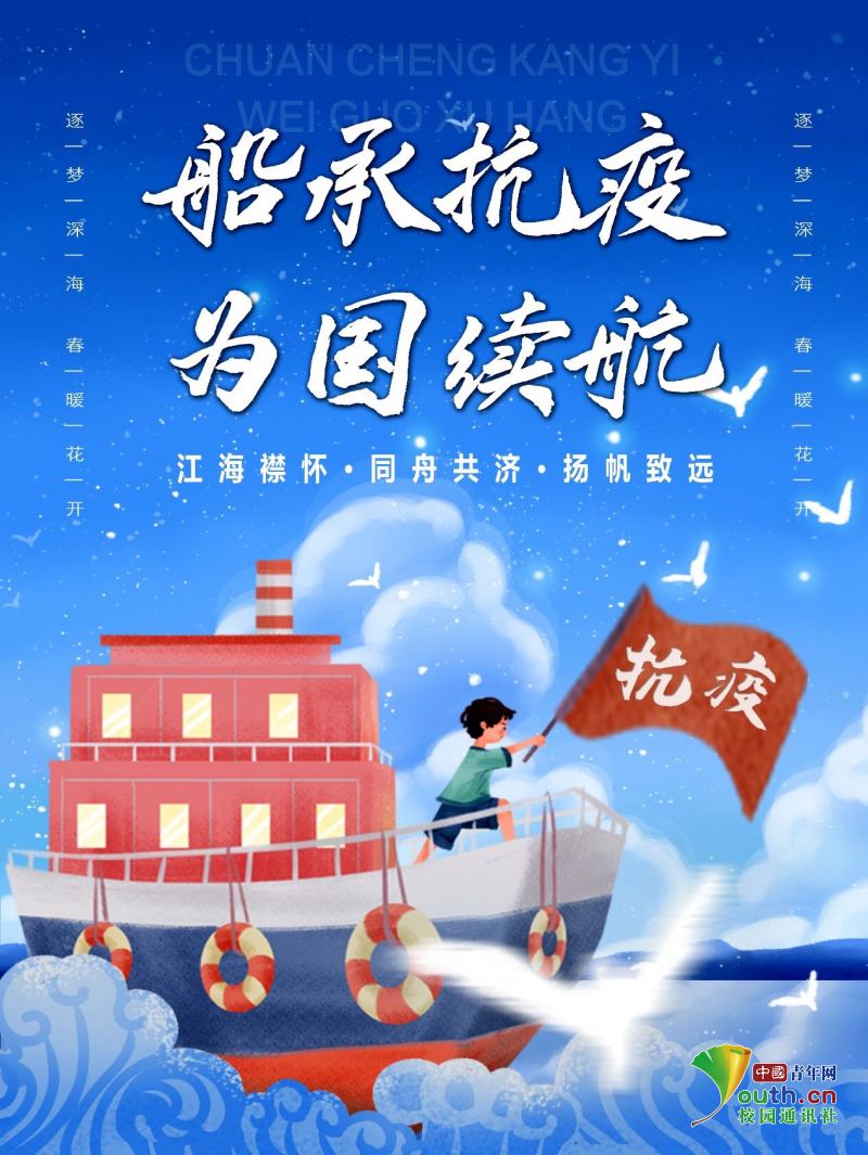 2020年原本的美好被一場突如其來的疫情所打破,圖中“船承抗疫,為國續航”這八個大字十分吸引人的眼球,圖中蔚藍的天空和大海象征著夢幻、愿望和期待,表現出人們對抗疫勝利充滿著信心,潔白的海鷗在海面上盡情翱翔,蘊含著希望。圖中的輪船,在朵朵浪花的簇擁之下向前航行,船上的人熱情的揮動著寫著大大的寫著“抗疫”二字的旗幟。在此次抗擊新冠肺炎疫情的戰疫中,船海學院也涌現出一大批走在抗疫前線的志愿者們,在國家和人民最需要的時候,做出無怨無悔的選擇,成為最美逆行者。他們同舟共濟、團結一心,一起向著希望的遠方航行。