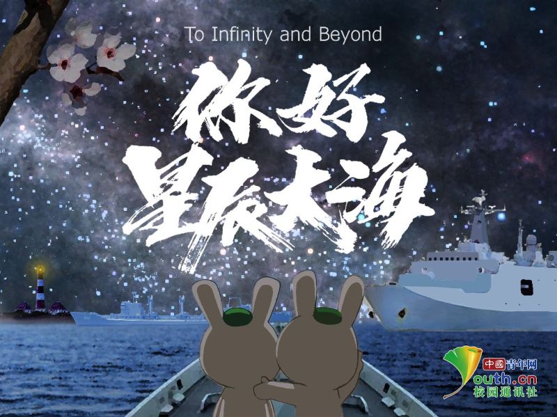 作品元素由近及遠,一一錯落鋪陳,以青年人喜愛的充滿活力的動漫畫風:兔子、大海、星空、中國海軍的主力艦艇以及用剛勁筆法書寫的“你好,星辰大海”字樣融合于一幅圖畫之中,并在左上角附以盛開的櫻花一枝,象征著不論經歷重重磨難,我們始終會迎來春天,明天依然會像春天般充滿盎然生機而富有希望。作品集中展現了船海人以仰望星辰大海為理想,以腳踏實地實現國家富強、民族復興為己任,以滿懷熱情、堅強樂觀為高尚情懷,努力地在逐夢路上跑出屬于自己的精彩!