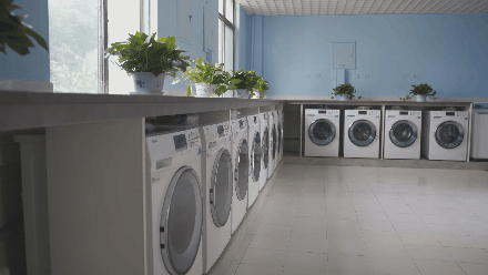“如果衣服臟了,不想動手洗怎么辦?”學校還為同學們專門開辟了自助洗衣房,嶄新的滾筒洗衣機將為同學們提供自助洗衣服務。另外,每一個學生組團,都有一個便民服務點,提供必要的生活用品、食品等,包括飯盒等都可以在便民服務點買到。