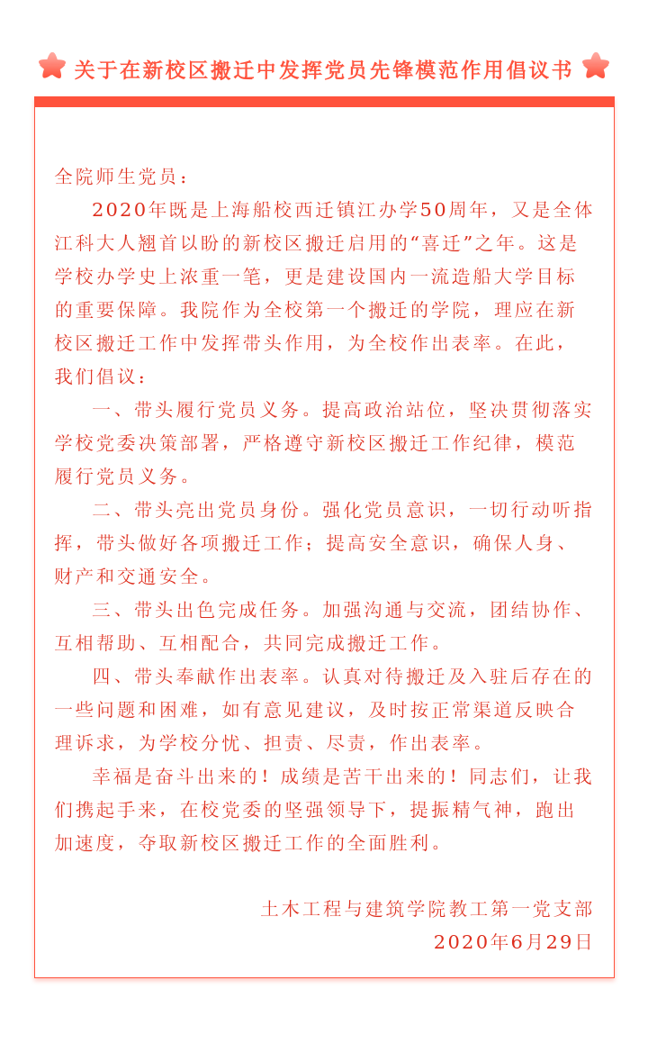 “帶頭履行黨員義務,帶頭亮出黨員身份,帶頭出色完成任務,帶頭奉獻作出表率”……早在6月24日,土建學院教工第一黨支部就在全院發起《關于在新校區搬遷中發揮黨員先鋒模范作用倡議書》,希望全體黨員做到“四個帶頭”,充分發揚先鋒模范作用。劉清生告訴記者,“關鍵時刻,每一位黨員都要發揮好帶頭作用,要有不怕苦不怕累的奉獻精神,要精誠團結、共同協作,相互提醒、守望相助,全力以赴做好新校區搬遷工作”。在大家的共同努力下,搬遷工作第一天就超額完成當天搬遷任務。