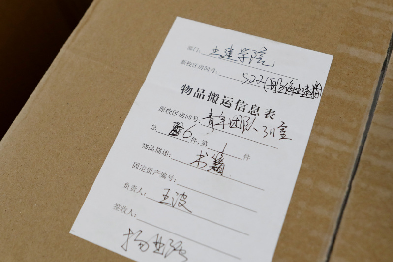 記者發現每一件搬運的物品上邊都貼有一張表格,上面有部門、新校區房間號、原校區房間號、物品編號、物品描述、固定資產編號、負責人、簽收人等信息。潘志宏告訴記者:“《物品搬運信息表》是學院精心設計印制的,每一件物品都有對應的信息表,上面寫有責任人,落實具體責任也保證搬遷的順利進行。”為了確保國有資產不流失,上車核對信息、簽字,下車核對信息、簽字,“我們任何一件物品都不能遺失,都不能丟掉。”劉清生告訴大家,搬遷工作是學院暑期工作的重中之重,所有工作都要服務于搬遷。