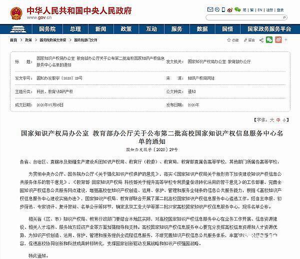 據了解,為貫徹中央辦公廳、國務院辦公廳《關于強化知識產權保護的意見》,落實《國家知識產權局關于新形勢下加快建設知識產權信息公共服務體系的若干意見》、《教育部 國家知識產權局 科技部關于提升高等學校專利質量促進轉化運用的若干意見》的工作部署,完善全國知識產權信息公共服務網點建設,增強高校在知識產權創造、運用、保護、管理和服務全鏈條的信息公共服務能力,根據《高校知識產權信息服務中心建設實施辦法》,國家知識產權局、教育部聯合開展了第二批高校國家知識產權信息服務中心遴選工作。