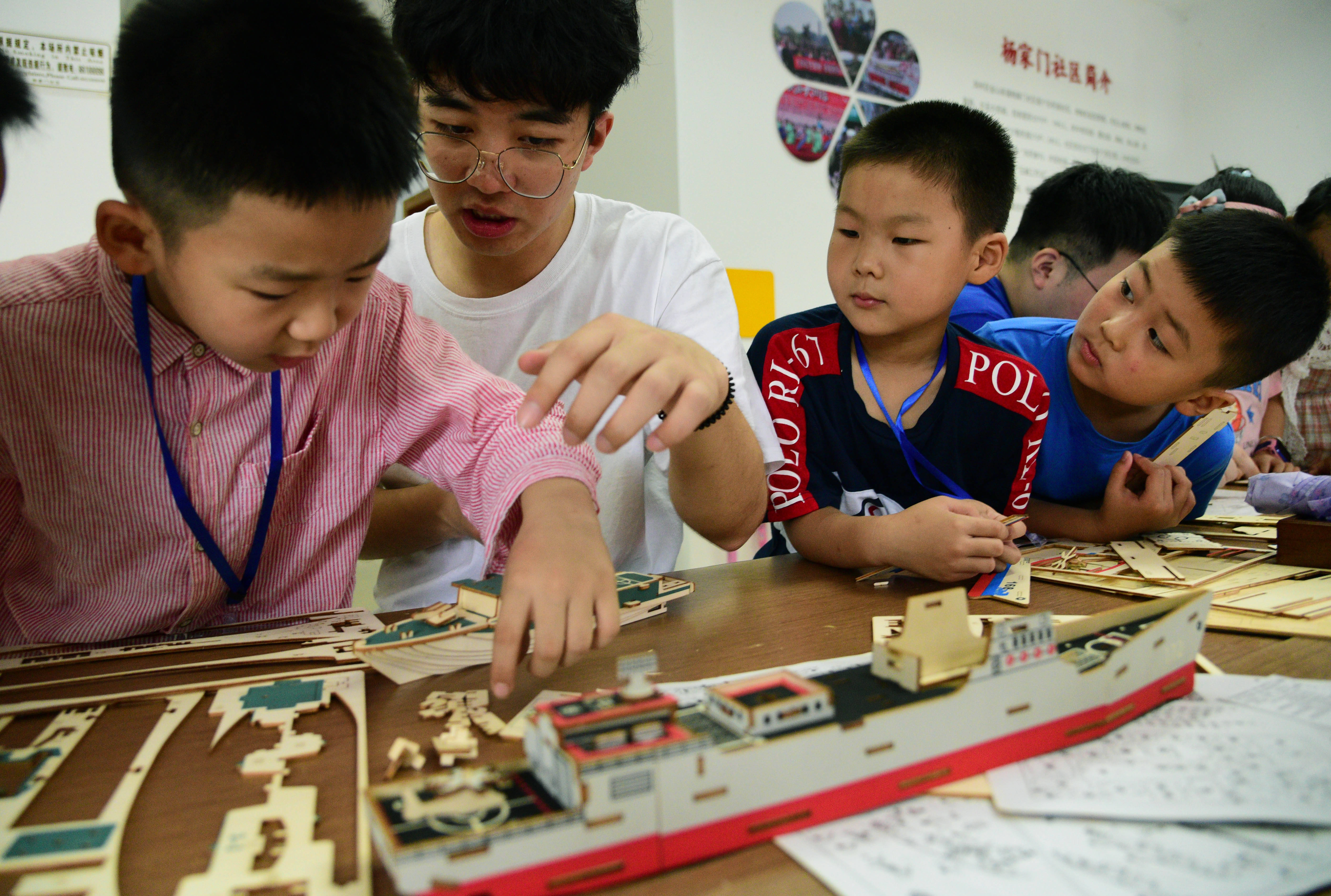 7月11日,在江蘇省鎮江市楊家門社區,江蘇科技大學志愿者在指導小朋友拼裝艦船模型。