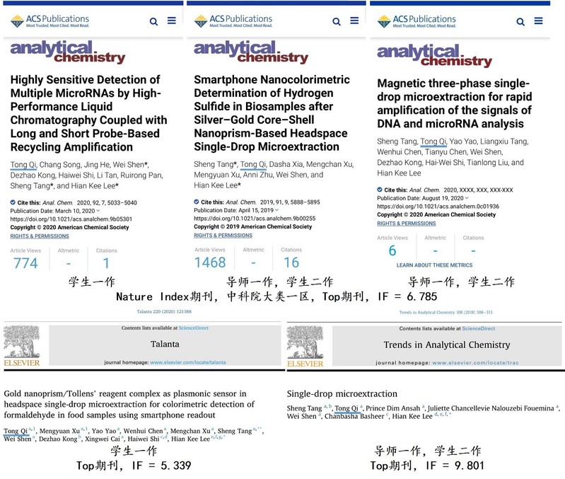 祁桐同學的碩士研究課題主要關注納米材料增強微萃取技術在生物分析過程的應用。其開發的多種磁性催化雙功能納米材料在傳統微萃取方法中發揮了獨特的分離和信號擴增作用。其設計的相關方法學在食品中硫化物檢測,血液中核酸分析等實際應用中獲得了有效的驗證。