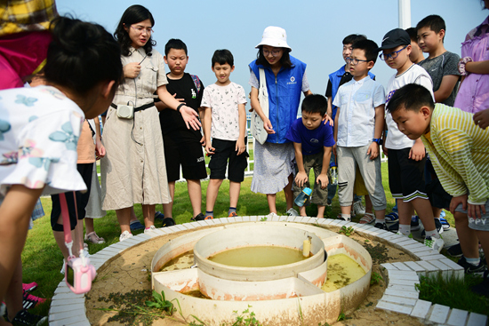 8月25日,江蘇鎮江,青年志愿者帶著小朋友在氣象站觀察了解蒸發皿的功能。當日,鎮江市潤州區天益愛心服務中心和江蘇科技大學志愿者帶著寶塔路街道鳳鳴新村社區的小朋友走進丹徒國家基本氣象站,學習氣象科普知識,豐富暑期生活。石玉成/視覺中國