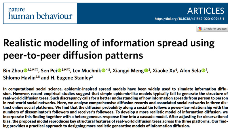 近日,我校經濟管理學院周斌副教授為第一作者和第一通訊作者的研究成果在Nature子刊《Nature Human Behaviour》上發表,該子刊影響因子為12.282(2020),題目為《Realistic modelling of information spread using peer-to-peer diffusion patterns》(https://www.nature.com/articles/s41562-020-00945-1),江蘇科技大學為論文的第一作者單位和第一通訊作者單位。