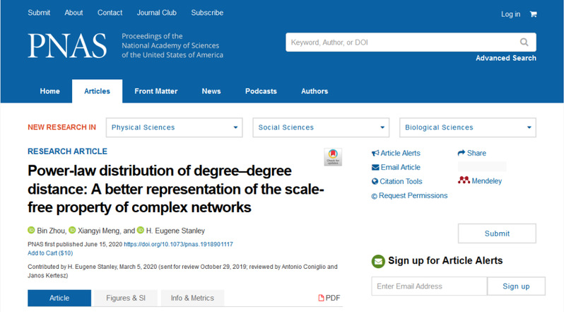此前,周斌副教授為第一作者的研究成果還在《PNAS》上發表,題目為《Power-law distribution of degree–degree distance: A better representation of the scale-free property of complex networks》(PNAS 2020, DOI: 10.1073/pnas.1918901117),該刊影響因子為9.58(2019),江蘇科技大學為論文的第一作者單位。該項研究是與美國Boston大學一院士團隊共同合作的結果,論文發表得到了國家自然科學基金及江蘇省優秀中青年骨干教師境外研修等項目資助。文中,作者首次提出了復雜系統度度距離的概念,重新理解復雜系統的無標度屬性,通過大量的實證數據統計分析發現度度距離指標比目前傳統的度分布指標可以更好地描述和理解復雜系統的無標度屬性,并建立了復雜系統演化機制模型,其模型解析和仿真結果也對實證統計結果進行了較好的再現和解釋。度度距離的概念從一個新的視角來理解復雜系統的無標度屬性,作為一個新的維度指標和復雜系統其它維度知識點相結合可以產生更多有價值的研究課題,同時對其跨學科領域也具有潛在的應用價值。