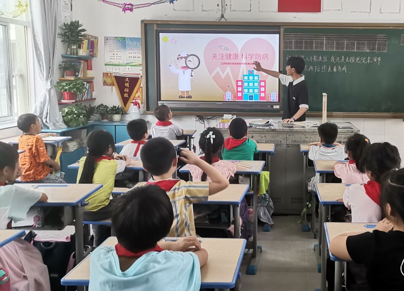 7月8日,江蘇科技大學生物技術學院青靈服務社大學生志愿者走進鎮江市丹徒區西麓中心小學,以“關注健康 科學防病”為主題,通過線上線下相結合的方式,開展科普防病健康知識實踐活動。志愿者們通過讓小學生們觀看“抗疫”小視頻,有獎提問等互動環節,讓西小孩子們進一步了解口罩如何正確使用及七步洗手法等科普知識。(鮑明成)編輯 凌雪峰