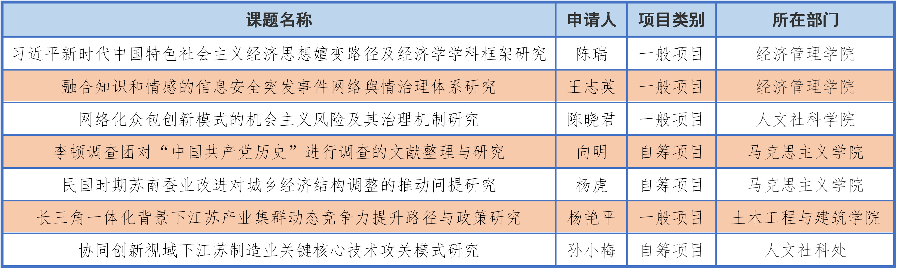 日前,江蘇省哲學社會科學規劃辦公室公布了2020年度省社科基金立項項目名單,我校共7項課題獲批年度項目立項,其中,一般項目4項、自籌項目3項。立項名單如下: