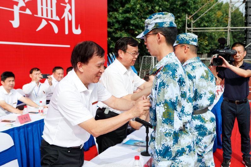 校黨委書記葛世倫、校長周南平給2020級本科生代表、管理科學與工程類新生沙晏民,海洋工程類新生徐開開頒授江蘇科技大學校徽,“一入科大門,一生科大人”,此刻起,2020級新生就是江科大的主人。