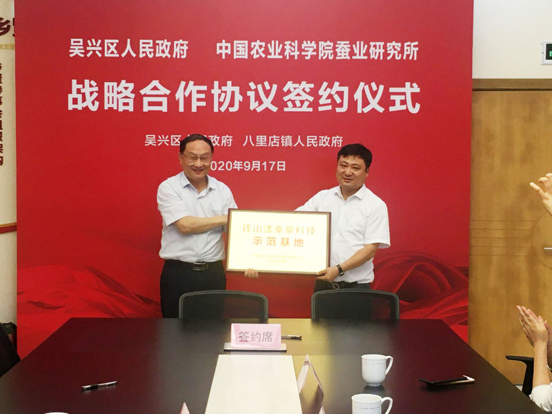 會(huì)上,李木旺所長(zhǎng)代表蠶業(yè)研究所與地方領(lǐng)導(dǎo)簽訂了合作協(xié)議,鄭培鋼書(shū)記為“錢(qián)山漾蠶??萍际痉痘亍笔谂?。