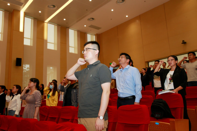 周南平校長為新教師代表張春雨博士頒發校徽。計算機學院景國良老師帶領全體新教師莊嚴宣讀《江蘇科技大學師德公約》,激勵新同事樹立崇高的職業理想和堅定的職業信念,將全部精力和滿腔熱情奉獻給祖國的教育事業。