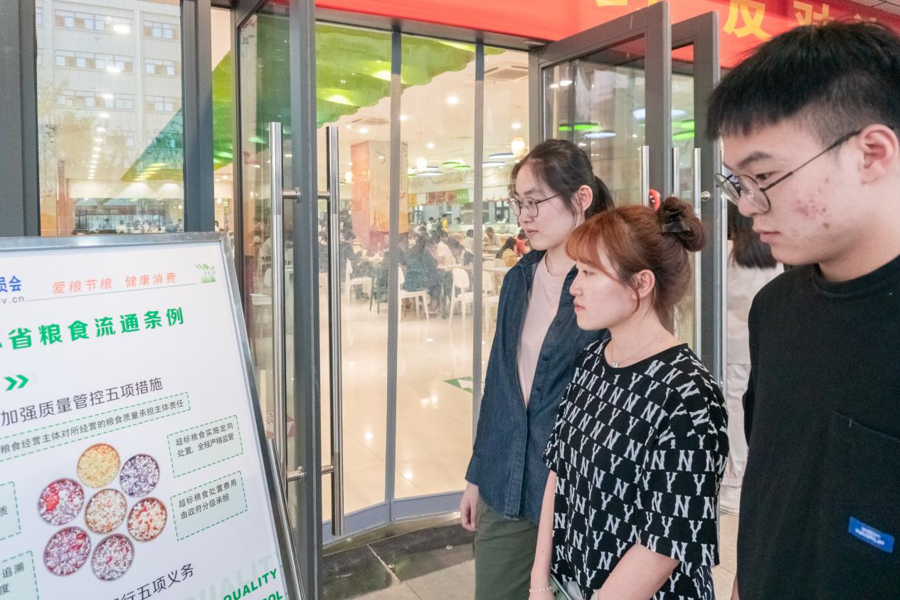 大屏幕前,循環展播著00后大學生自己制作的“誰知盤中餐粒粒皆辛苦”科普短片吸引一眾學生圍觀學習,各種餐飲節約小知識引導大家減少餐桌、餐盤剩飯菜現象;來往學校餐廳的學生們駐足觀看節糧愛糧海報,了解糧食流通條例、學習“堅決制止餐飲浪費”倡議書、糧油健康消費常識等內容。計算機學院的劉源同學表示:“剛剛吃完飯經過這里,看到這么多海報,很有意思,同時也學到了好多有用的食品安全和糧食節約小知識,我覺得厲行節約,反對浪費應該成為每個公民的自覺意識。”