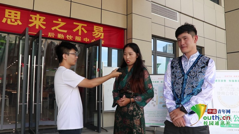 來自西藏的達瓦和來自新疆的阿依曼同學接受記者采訪 中國青年網通訊員 孔凡 攝
