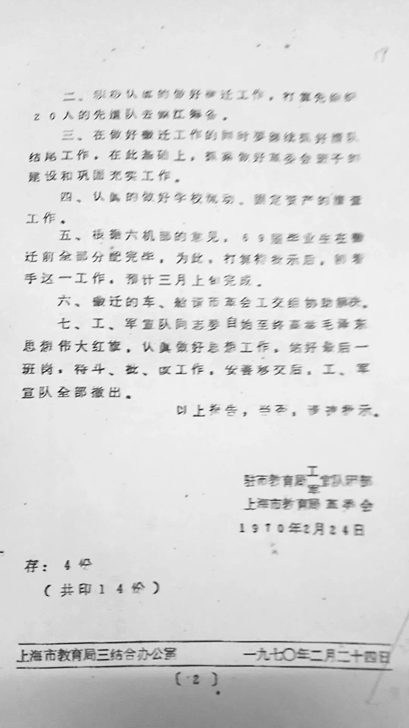 為了落實(shí)六機(jī)部軍管會(huì)的決定,駐校工宣隊(duì)、軍宣隊(duì)把學(xué)校搬遷作為首要任務(wù),要求一切為了搬遷,一切服從搬遷,不允許有任何干擾。在那樣的政治壓力下,群眾中的許多思想和實(shí)際困難等問題也就不了了之了。