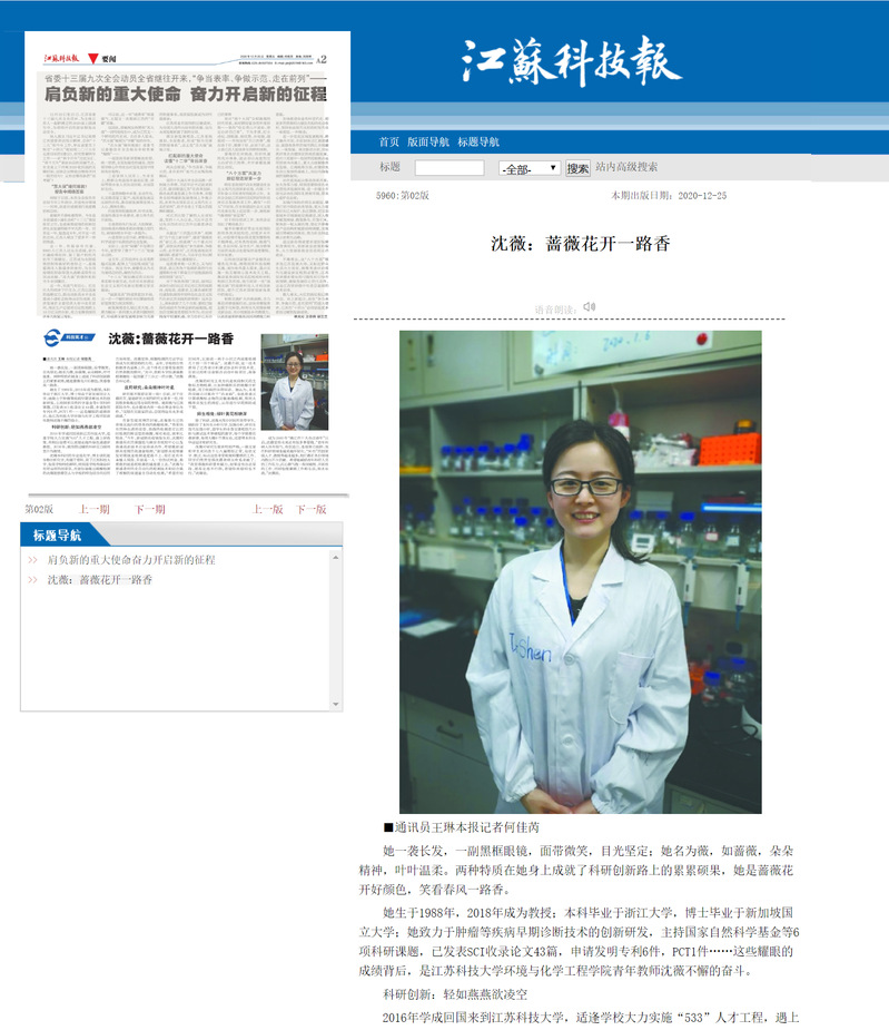 她生于1988年,2018年成為教授;本科畢業于浙江大學,博士畢業于新加坡國立大學;她致力于腫瘤等疾病早期診斷技術的創新研發,主持國家自然科學基金等6項科研課題,已發表SCI收錄論文43篇,申請發明專利6件,PCT1件……這些耀眼的成績背后,是江蘇科技大學環境與化學工程學院青年教師沈薇不懈的奮斗。