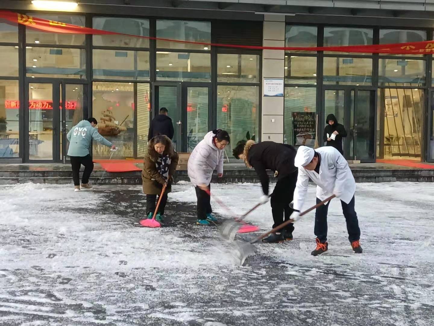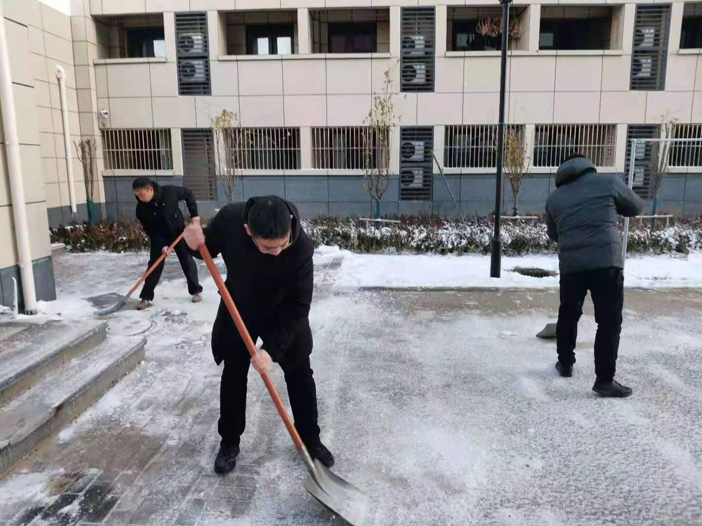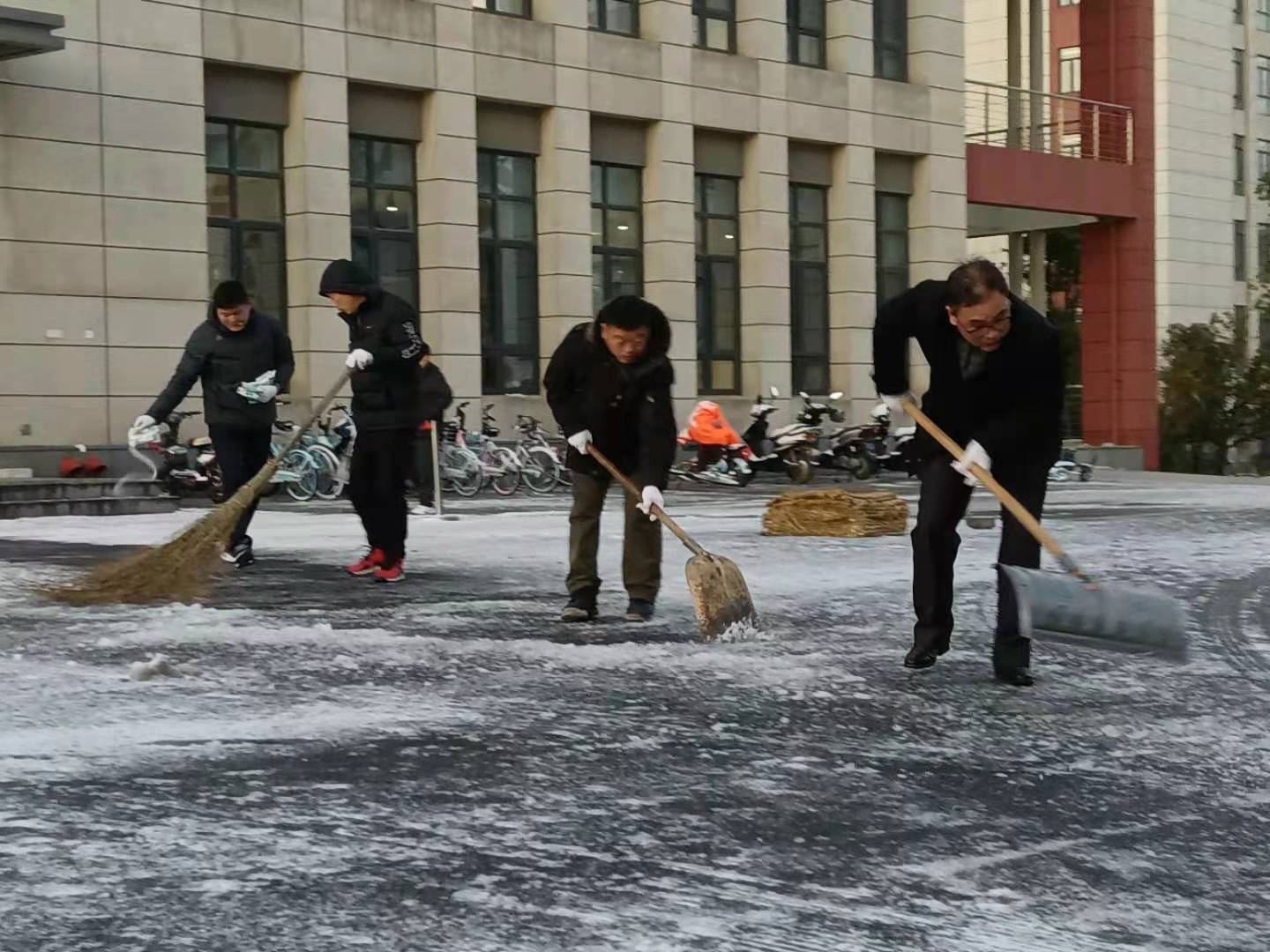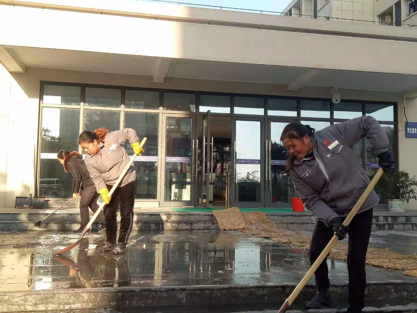 按照工作預案,30日凌晨,一組人員集中清理北大門周邊道路,另一組重點清理圖書館南面的浦江路,其他人各自為戰,負責打通教學樓宇、學生公寓和學生食堂門口的道路。由于天氣寒冷,積雪都已結冰,增加了清理的難度。大家不畏嚴寒、分工協作、相互配合,有的用鐵鍬鏟,有的用掃帚掃,有的撒融雪鹽,有的鋪防滑草墊,經過三個多小時奮戰,幾條主干道和樓宇前的通道全部打通,保證了師生出行安全。華舟物業的朱麗萍一邊賣力地鏟除船舶土建樓地下停車場入口處的積雪一邊說:“停車場入口朝北,路面上凍后異常堅硬,撒上工業鹽過了些時間,冰面在能夠逐漸被鏟除,但依然十分困難”。物業中心的徐才生介紹,長時間在零下的低溫環境工作,“剛開始冷得直發抖,但是大家都很投入地干活,越干越熱,現在身上都在冒汗,已經感覺不到寒冷。”