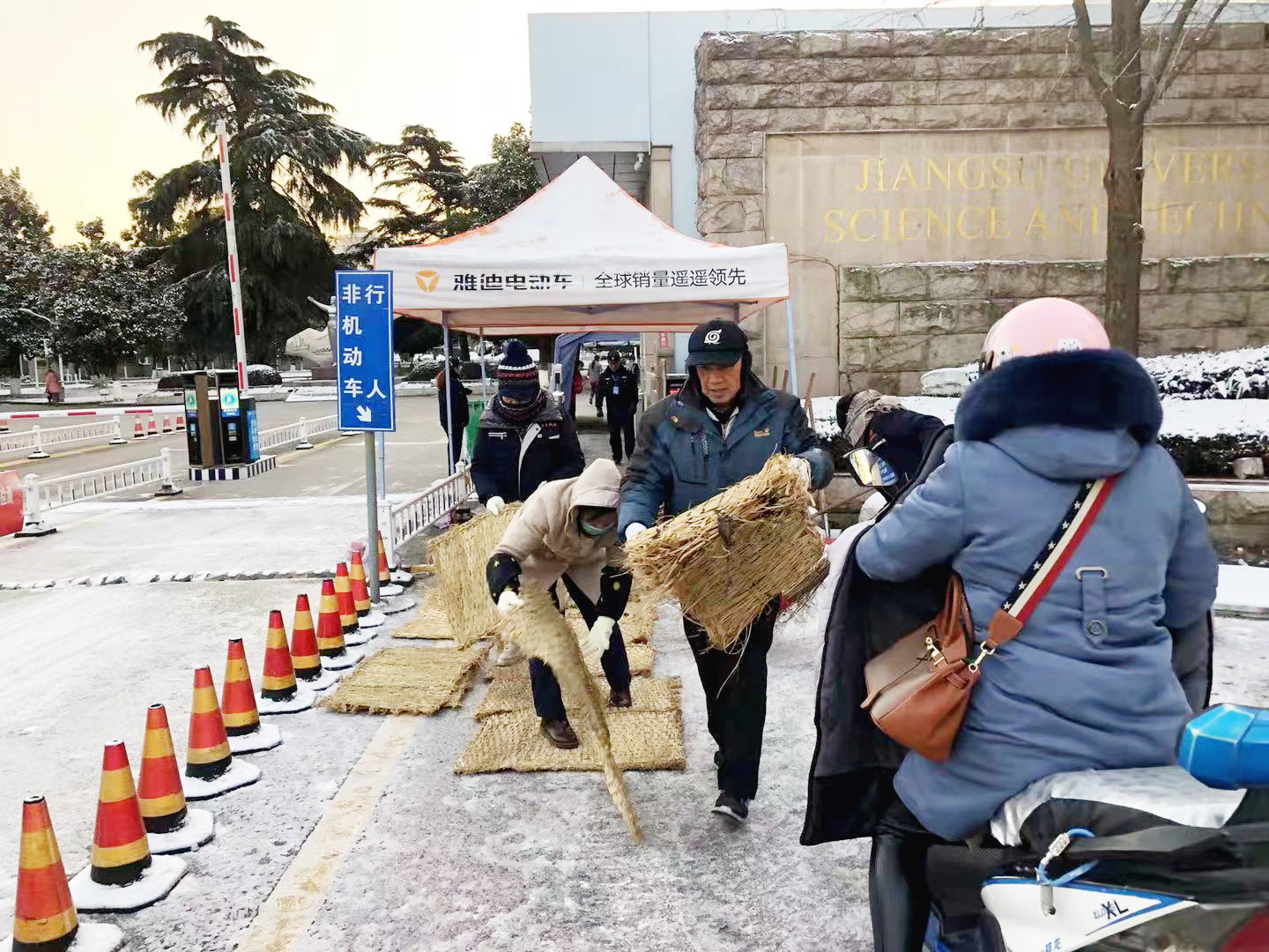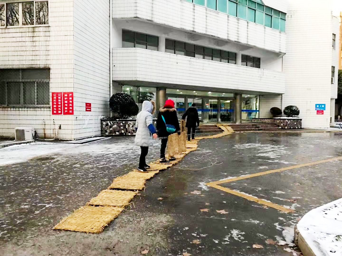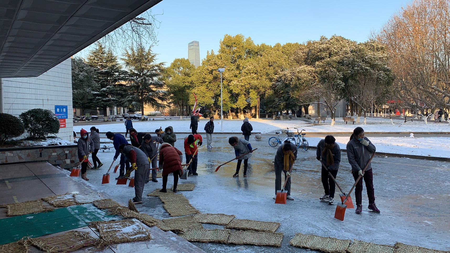 面對29日洋洋灑灑絲毫沒有停歇的大雪,后勤集團負責人判斷次日學校必然有艱巨的“除雪”任務。當晚八點,后勤物業部門的同志頂著寒風,冒著大雪在校園主干道上撒布融雪鹽,減少道路冰凍。為了讓員工避免次日上班路上奔波,后勤集團在校內安排了夜晚休息場所。物業中心羅菊蘭的家中有老人,不得不在晚上回去照顧,第二天再趕到學校:“天氣非常寒冷,路面都凍起來了,為了不被路況耽擱,凌晨四點鐘就從家里慢慢地騎電瓶車趕往學校。”