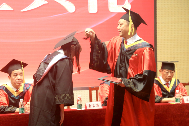 副校長任南宣讀“關于準予2021屆本科生畢業的決定”和“關于授予2021屆本科生學士學位的決定”。副校長嵇春艷宣讀“關于準予2021屆博士、碩士研究生畢業的決定”和“關于授予2021屆研究生博士學位、碩士學位的決定”。校黨委副書記、副校長景旭文宣讀表彰優秀本科畢業生、優秀研究生的決定。主席臺的領導和導師們為優秀畢業生頒發榮譽證書,為畢業生代表發放畢業證書。