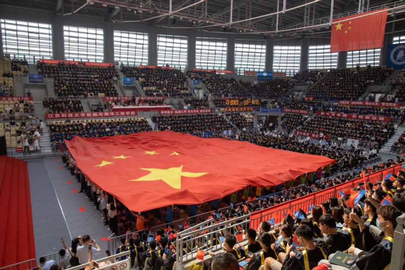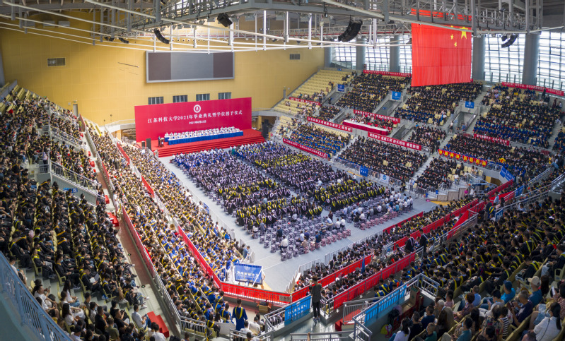 22日上午8點25分,暖場大合唱《我和我的祖國》歌聲繞梁,100位志愿者護旗手共同擎舉巨幅國旗走進主會場,鮮艷的五星紅旗輝映著畢業生手中的校旗、手舉牌,耀目的色彩襯托出青春的生動笑顏。8點30分,樂聲轉換,掌聲雷動,江蘇科技大學2021屆畢業典禮暨學位授予儀式大幕開啟,新浪、B站等多路視頻通道全程直播。畢業典禮主會場設鎮江大學城共享體育館,張家港校區設置視頻分會場。