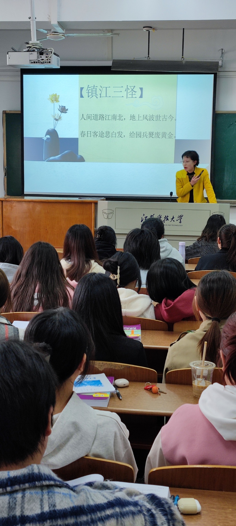 “鎮江城里有三怪:面鍋里面煮鍋蓋,鎮江肴肉不當菜,鎮江香醋擺不壞…….”耳熟能詳的民謠里蘊含著鎮江這座歷史文化名城豐厚的人文風情,從天南海北聚集到鎮江的學子們在英語課堂里領略到這座城市的文化底蘊。“Do you know three specialties in Zhenjiang? The pot cover noodle,salted pork in Jelly and Zhenjiang vinegar ...”劉燕平研究員和王歡博士分別用漢語和英語繪聲繪色地描述著歷史文化名城豐厚的人文風情,聆聽的同學們更是饒有興趣地認真聽講,不時地做著筆記。在王歡博士的指導下,同學們把對第二故鄉鎮江的認知融入到豐富的語言表達中,知而會其意,譯則不失其意。聽完這堂中西合璧的民俗課程后,外院學子紛紛表示課堂氛圍活潑生動、信息量大,深感受益匪淺。