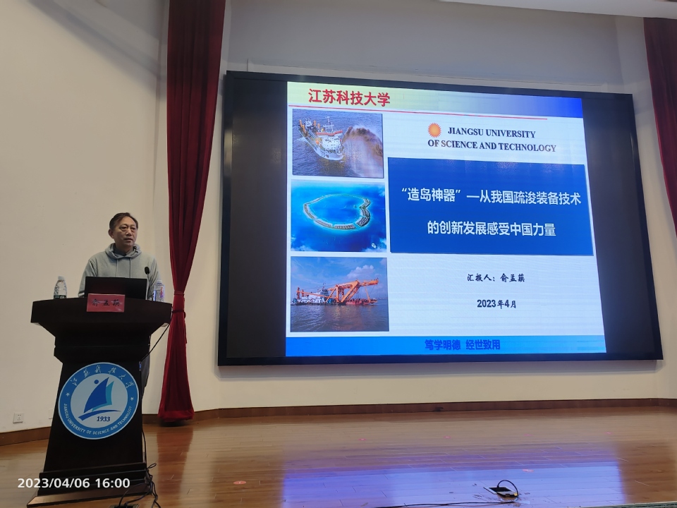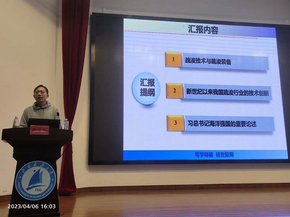俞孟蕻教授開始以江蘇科技大學(xué)近年來在船舶海工領(lǐng)域所取得的標(biāo)志性成果為引,從“疏浚技術(shù)與疏浚裝備”“新世紀(jì)以來我國(guó)疏浚行業(yè)的技術(shù)創(chuàng)新”和“習(xí)近平總書記海洋強(qiáng)國(guó)的重要論述”三個(gè)方面,詳細(xì)講解了我國(guó)疏浚技術(shù)的發(fā)展歷程,技術(shù)創(chuàng)新步伐和實(shí)際應(yīng)用場(chǎng)景。俞教授以實(shí)際事例告訴廣大同學(xué),“一個(gè)民族的強(qiáng)大與發(fā)展,將取決于這個(gè)民族的海洋文化的建設(shè),海洋意識(shí)觀念的強(qiáng)弱。”