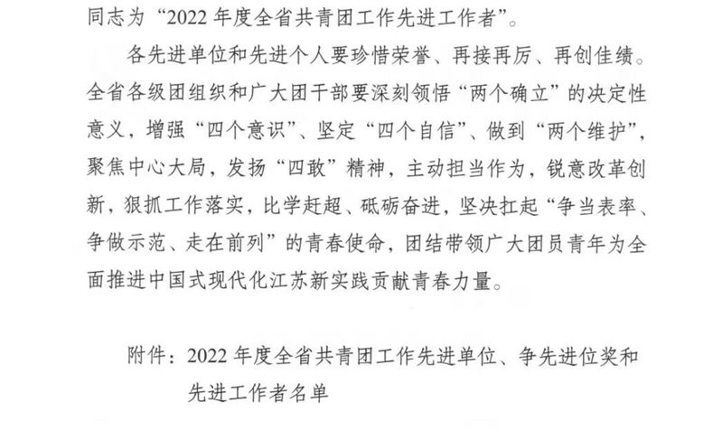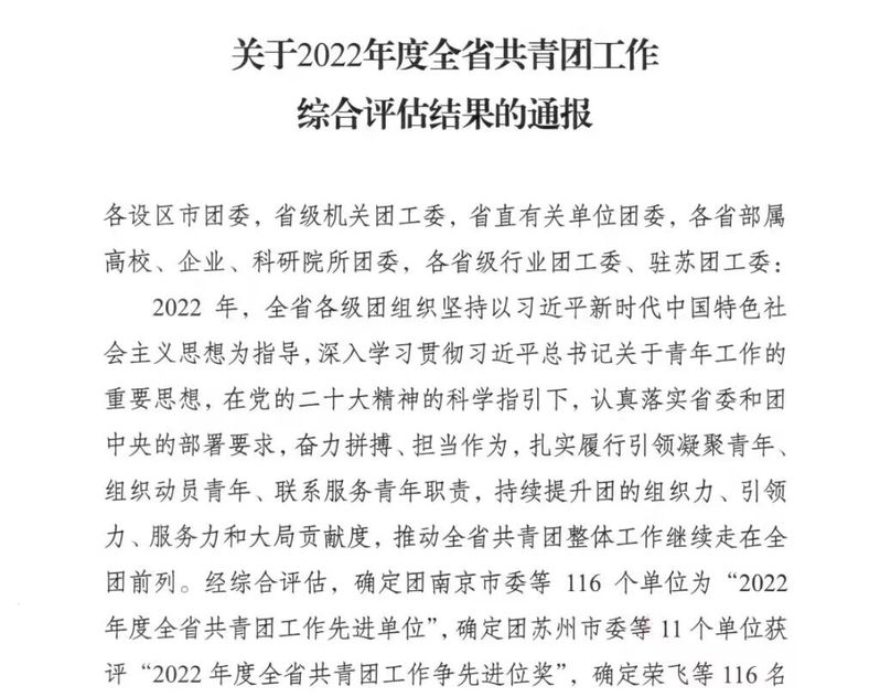近日,共青團江蘇省委印發《關于2022年度全省共青團工作綜合評估結果的通報》(團蘇委發〔2023〕3號),我校團委獲評“2022年度全省共青團工作先進單位”,校團委副書記張冬冬同志獲評“2022年度全省共青團工作先進工作者”。據悉,經綜合評估,全省共有團南京市委等116個單位獲評“2022年度全省共青團工作先進單位”,11個單位獲評“2022年度全省共青團工作爭先進位獎”,116名同志獲評“2022年度全省共青團工作先進工作者”。