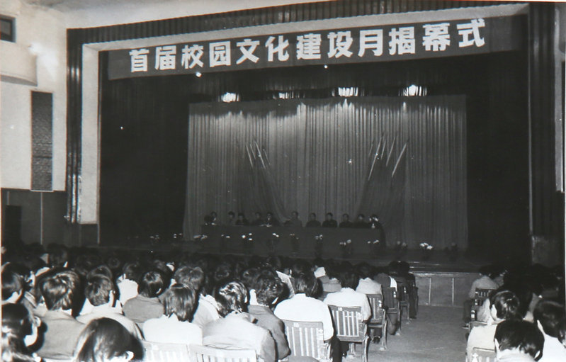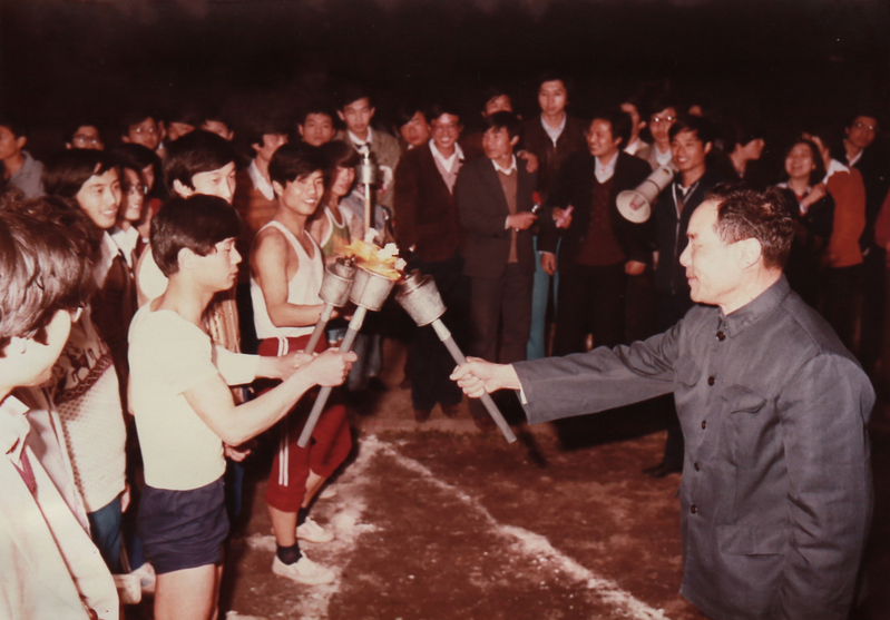 1987年,紀念“五四”火炬接力賽前,學校黨委書記杜義龍同志點燃火炬