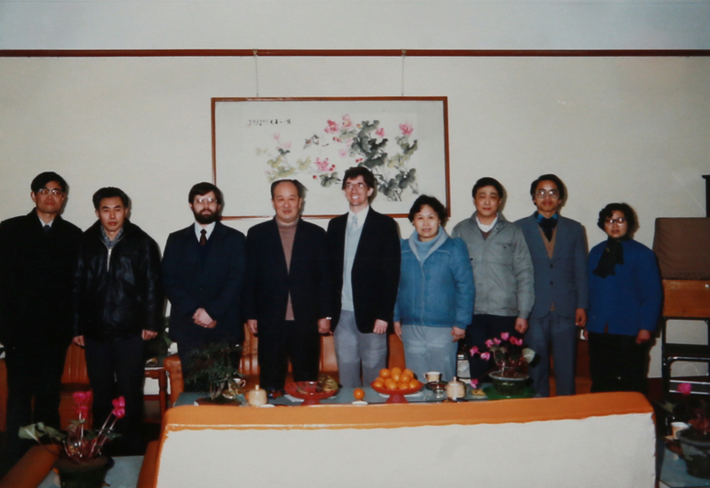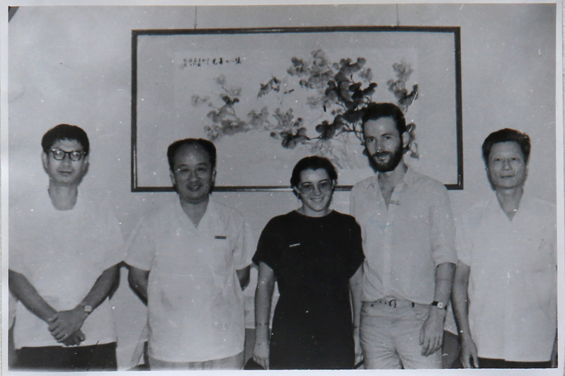 1985年,鎮江船舶學院陳寬院長等歡迎英國文教專家艾倫·帕爾(右二)前來教授英語