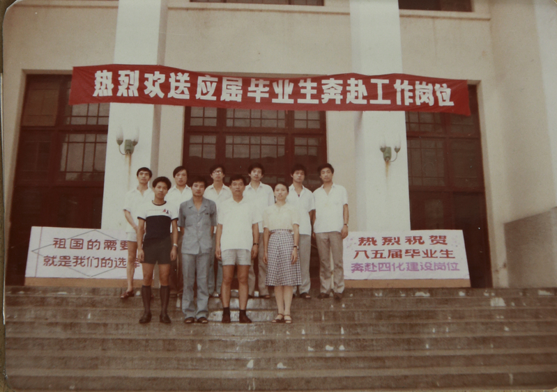 1985年7月,鎮江船舶學院歡送85屆學生奔赴工作崗位(攝于大禮堂外)
