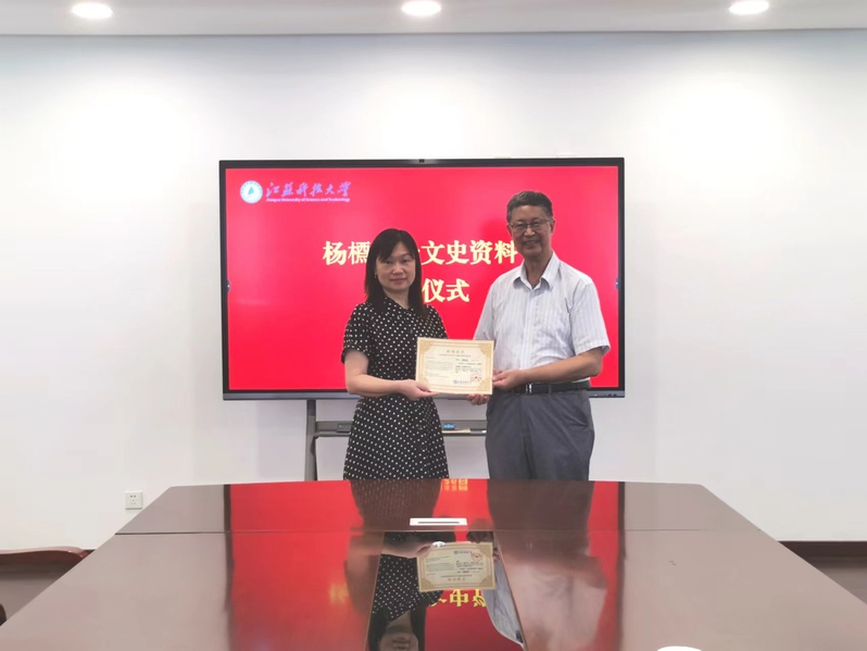 周春燕還代表學校向楊院士及其家人表示敬意和感謝,并頒發了捐贈證書。她指出,與楊院士的緣分是學校的寶貴歷史財富,本次捐贈的文史資料將為學校發揮校史資政育人功能提供重要素材。她表示,學校將充分利用這份寶貴資源,進一步傳承科學家精神,弘揚興船報國、鑄魂育人的使命,助推學校高質量發展和高水平大學建設。