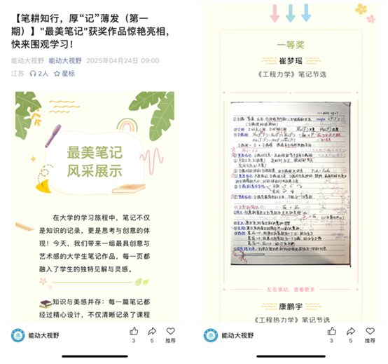 在學風建設過程中,學院高度重視學生學習習慣和方法的培養。為鼓勵學生以筆為友、以學為樂,舉辦“筆耕知行、厚‘記’薄發”最美筆記比賽,征集學生在課程學習中的精彩筆記作品,展現能動學子嚴謹認真的學習態度與良好的知識歸納能力。優秀作品在學院微信公眾號進行展示推送,形成榜樣引領、學習交流、文化傳播的三重效應,為濃厚學風注入源源不斷的內驅動力。