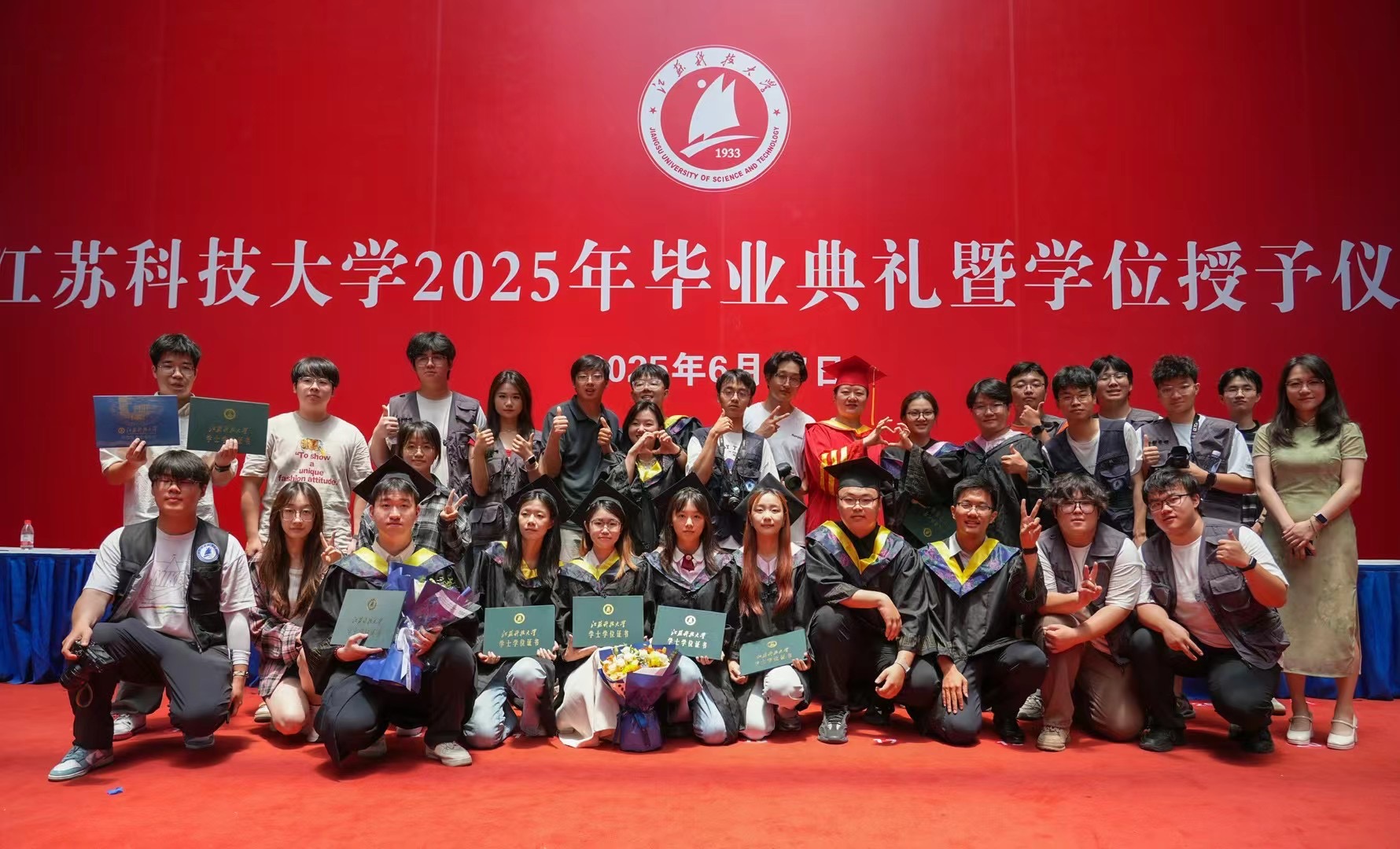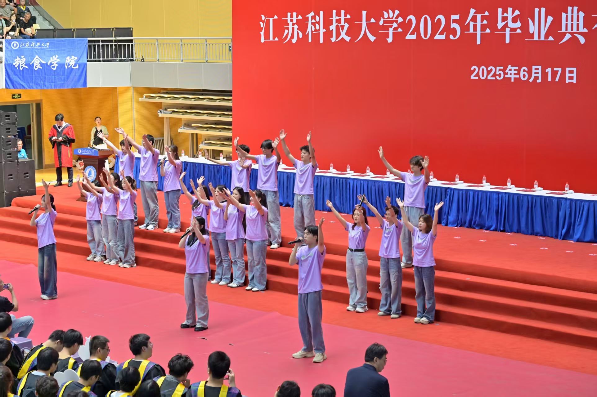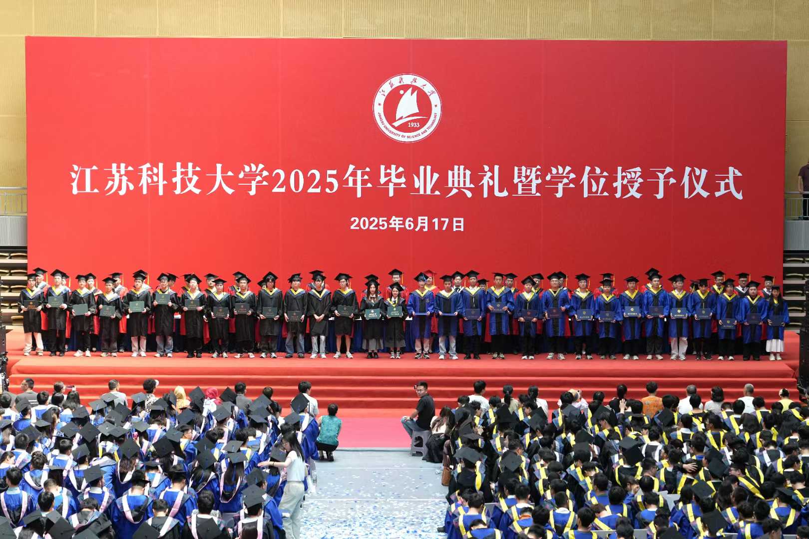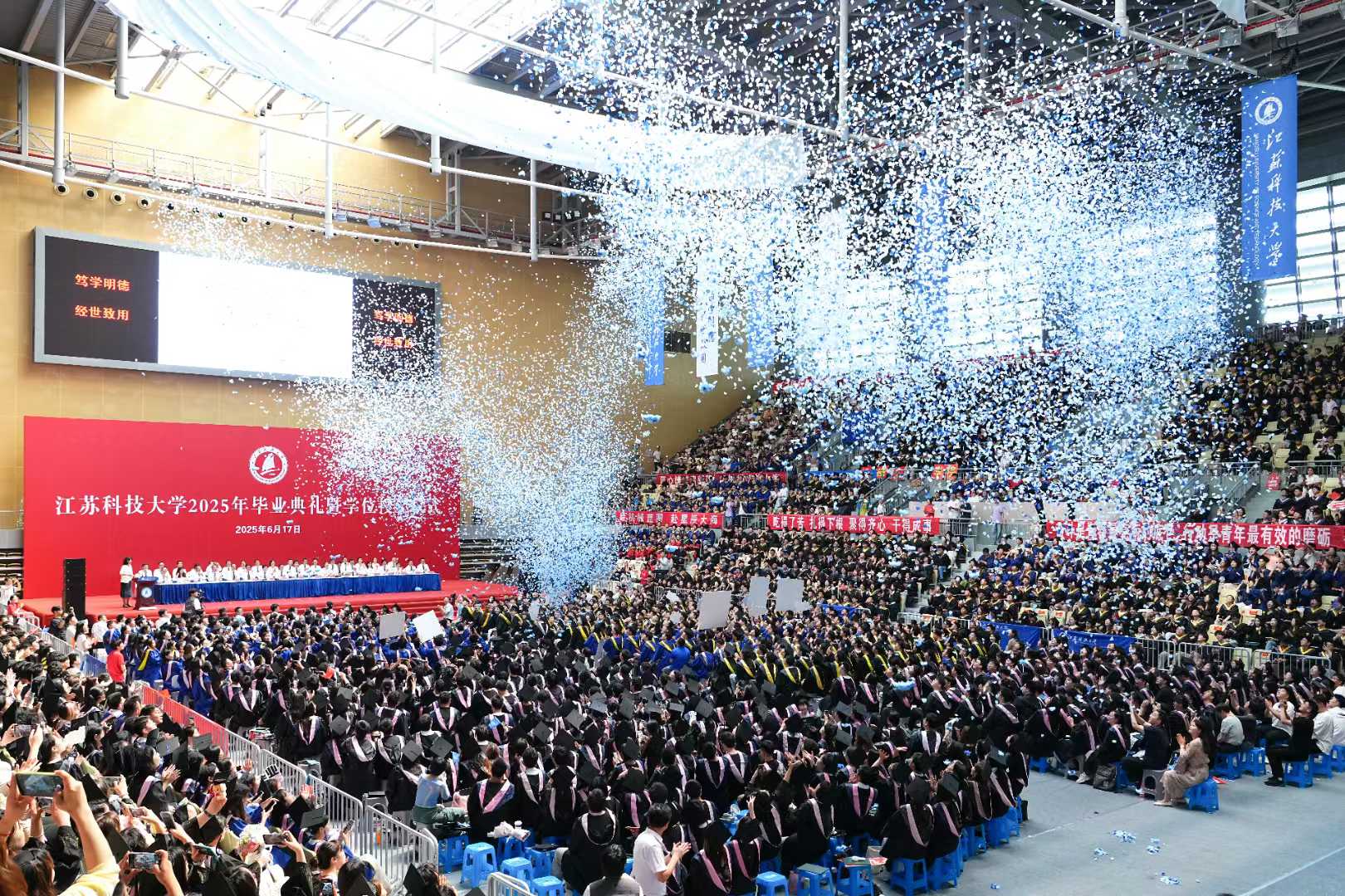 花開盛夏,畢業(yè)驪歌如約響起。6月17日上午,江蘇科技大學2025年畢業(yè)典禮暨學位授予儀式盛裝啟幕。5510位本科同學,1689位博碩士研究生同學和148位來自34個國家的留學生行撥穗正冠之禮,共上大學“最后一課”,懷揣殷殷囑托和深深祝福從學校啟程,書寫遠航者的傳奇。學校為每位畢業(yè)生送上獨家限定畢業(yè)禮物——“拼啟未來·磚屬回憶”拼搭文創(chuàng)。當天還是19位畢業(yè)同學的生日,學校特別準備了蛋糕,祝他們畢業(yè)和生日“雙份”快樂。