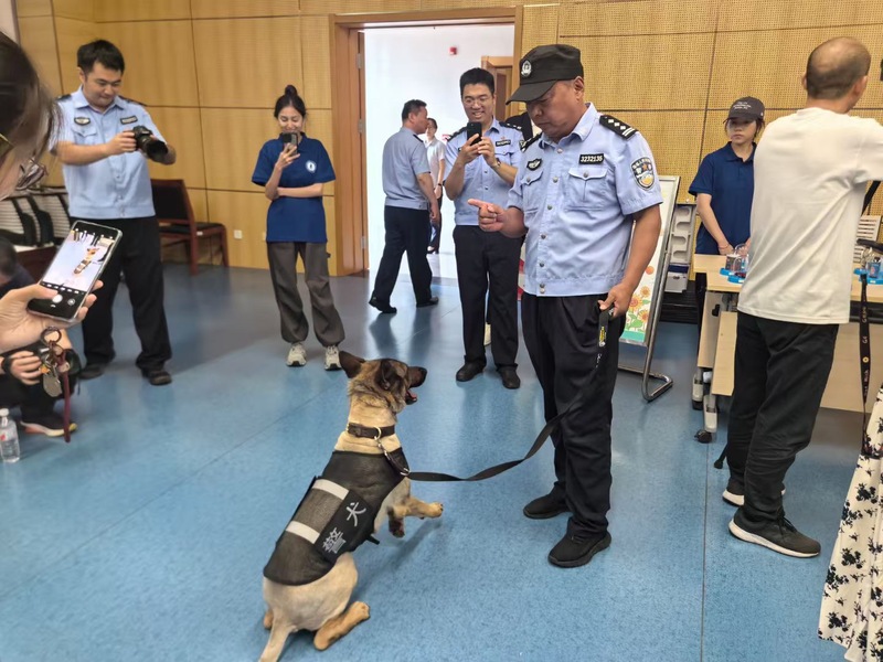 在禁毒互動小屋體驗環節中,活動雙方精心設置了多個功能區域:識毒防毒區展示30余種毒品仿真模型;戒毒所民警現場講解新型毒品偽裝形式,如“奶茶”“跳跳糖”等;VR沉浸體驗區通過模擬吸毒后的幻覺和身體機能衰退等場景,增強了警示效果;“吸毒后的你”設備借助人臉識別、AI算法及虛擬現實技術,讓學生直觀感受吸毒對身心的毀滅性影響。此外,還有戒毒項目展示區和緝毒犬工作展示。