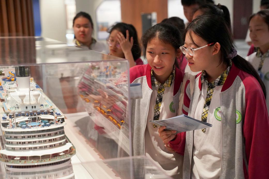 在講解員的引導下,鎮江三中的師生們通過珍貴文字、圖片、實物與影像資料,系統了解江蘇科技大學的辦學歷史。校史館內的“船舶特色展廳”“蠶桑特色展廳”生動詮釋了一代代江科大人艱苦奮斗的歷程。