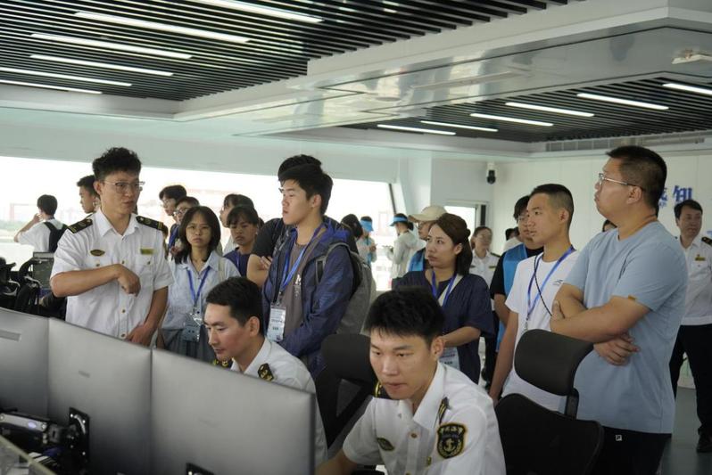 營員們登上“海巡0639”艇,駛向融合多種前沿功能的水上綠色服務區,親身體驗“一次靠泊、多項服務” 模式為船員工作與生活帶來的極大便利,深刻認識水上交通精細化管理與綠色航運發展的重要意義。他們還前往六圩河口快反處置中心,現場觀摩精彩的海事應急處置演練,直觀感受高新技術在海事動態監管、應急救援等方面的高效應用。先進的設備、專業的操作不僅展現了長江鎮江段綜合治理的現代化水平,也激發了青年學子對海洋與航運事業的濃厚興趣。