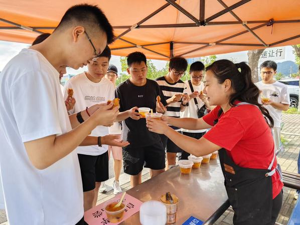 在稼穡學堂,新生家庭共同參與勞動實踐,一起品嘗學堂農田收獲的紅薯和暖心暖胃的紅棗枸杞蜜薯湯,祝愿新生的大學生活像蜜薯一樣軟糯香甜、美美滿滿。