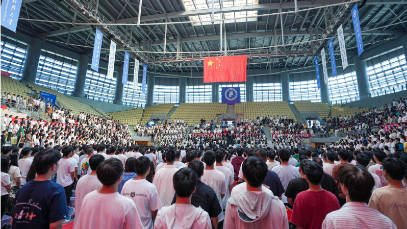 典禮在莊嚴的國歌聲中拉開帷幕,全場師生肅立齊唱,會場氣氛正式而熱烈,新生們目光堅定,展現出昂揚的精神風貌。