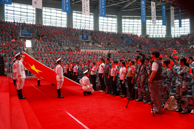 旗之所向,心之所往。典禮上,學(xué)校舉行了盛大的迎國(guó)旗、唱國(guó)歌儀式。經(jīng)學(xué)校申請(qǐng)和天安門管委會(huì)審批,學(xué)校獲贈(zèng)了90周年校慶日當(dāng)天(2023年10月26日)在天安門廣場(chǎng)升掛的國(guó)旗,國(guó)旗編號(hào)為2023-0299。典禮現(xiàn)場(chǎng),校國(guó)旗護(hù)衛(wèi)隊(duì)隊(duì)員手捧國(guó)旗列隊(duì)入場(chǎng),7000余名師生禮迎國(guó)旗,高唱國(guó)歌,莊重宣誓“強(qiáng)國(guó)有我,請(qǐng)黨放心!江科大人定不負(fù)韶華,以青春之我,筑夢(mèng)青春中國(guó)!”愛國(guó)主義精神激蕩在每一位江科大學(xué)子的心胸。