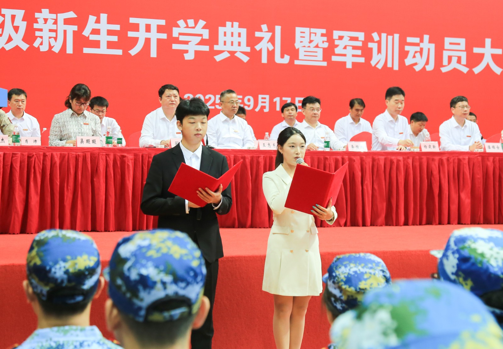 在全場(chǎng)熱切矚目中,楊建新、潘錦全、李恒川為2025級(jí)新生代表頒授校徽,王志東為軍訓(xùn)獨(dú)立團(tuán)授旗。