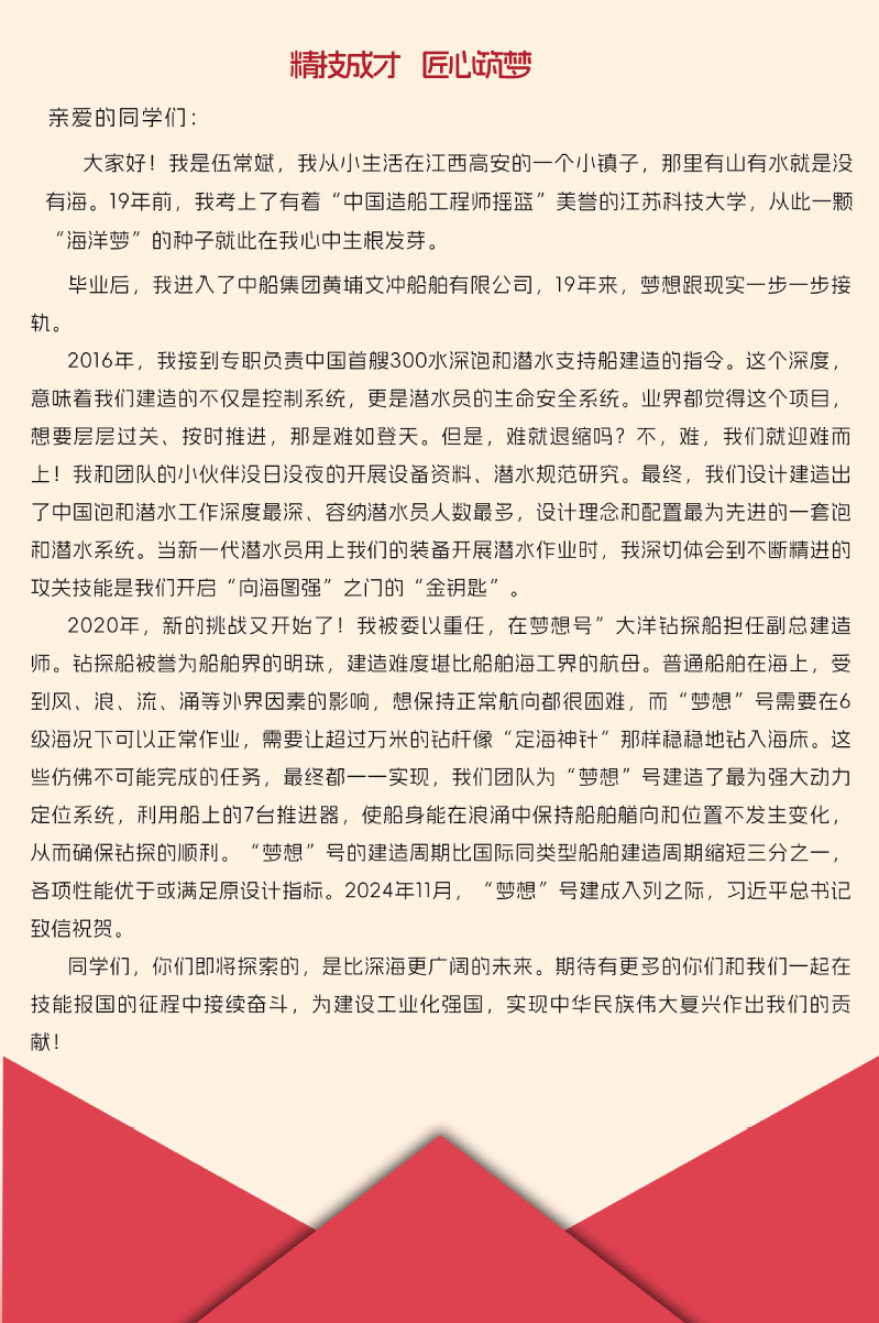 今年的“開學第一課”以“青春與祖國同行”為主題,以一堂“思政大課”的形式,邀請13位高校師生代表,分別在“生逢其時”“青春有為”“強國有我”三個篇章,講述他們與祖國同行的青春故事。伍常斌作為“強國有我”篇章的演講嘉賓,以《精技成才 匠心筑夢》為題,用“開拓創新、團結協作、攻堅克難、勇攀高峰”的“夢想號”精神和全體大學生共勉,勉勵學子在技能報國的征程中接續奮斗,為建設工業化強國,實現中華民族偉大復興作出貢獻。