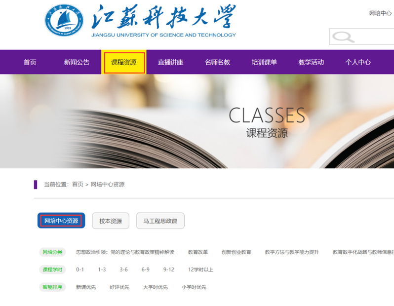 首次參加在線課程培訓的教師,需在江蘇科技大學教師教師教學發展中心在線學習中心網站(網址https://onlinenew.enetedu.com/just)。賬號注冊及課程激活須通過校園網的IP地址段內進行,激活后即可利用網絡平臺或移動平臺在任意場所學習。注冊登錄后點擊“網培中心資源”即可進行選課學習,選課數量不受限制。