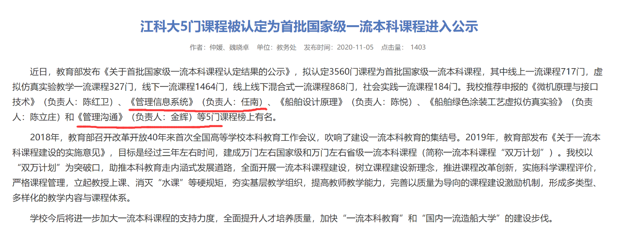 “管理信息系統”與“管理溝通”入選首批國家一流課程,《船舶集成制造管理理論與方法》獲批省立項重點教材。